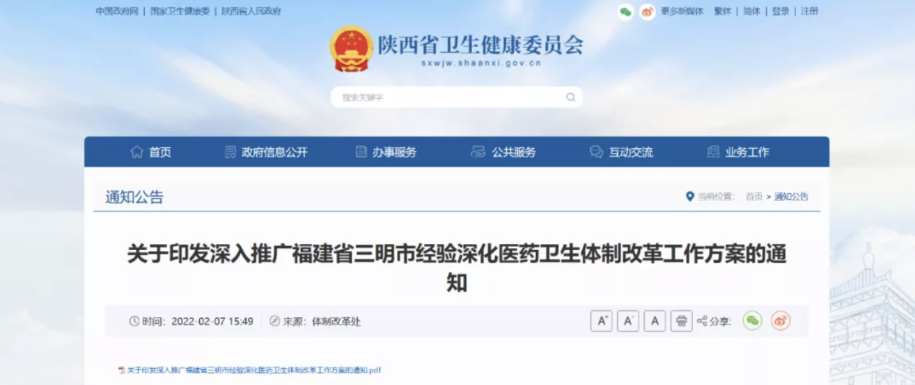为因地制宜推广三明医改经验,深化医疗、医保、医药联动改革,促进优质医疗资源均衡布局,保障可持续的公立医疗机构运行新机制,近日,陕西省卫健委发布《关于印发深入推广福建省三明市经验深化医药卫生体制改革工作方案的通知》(以下简称《方案》)。